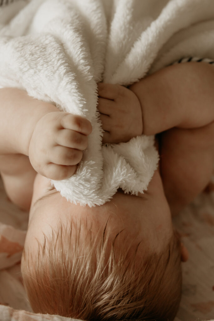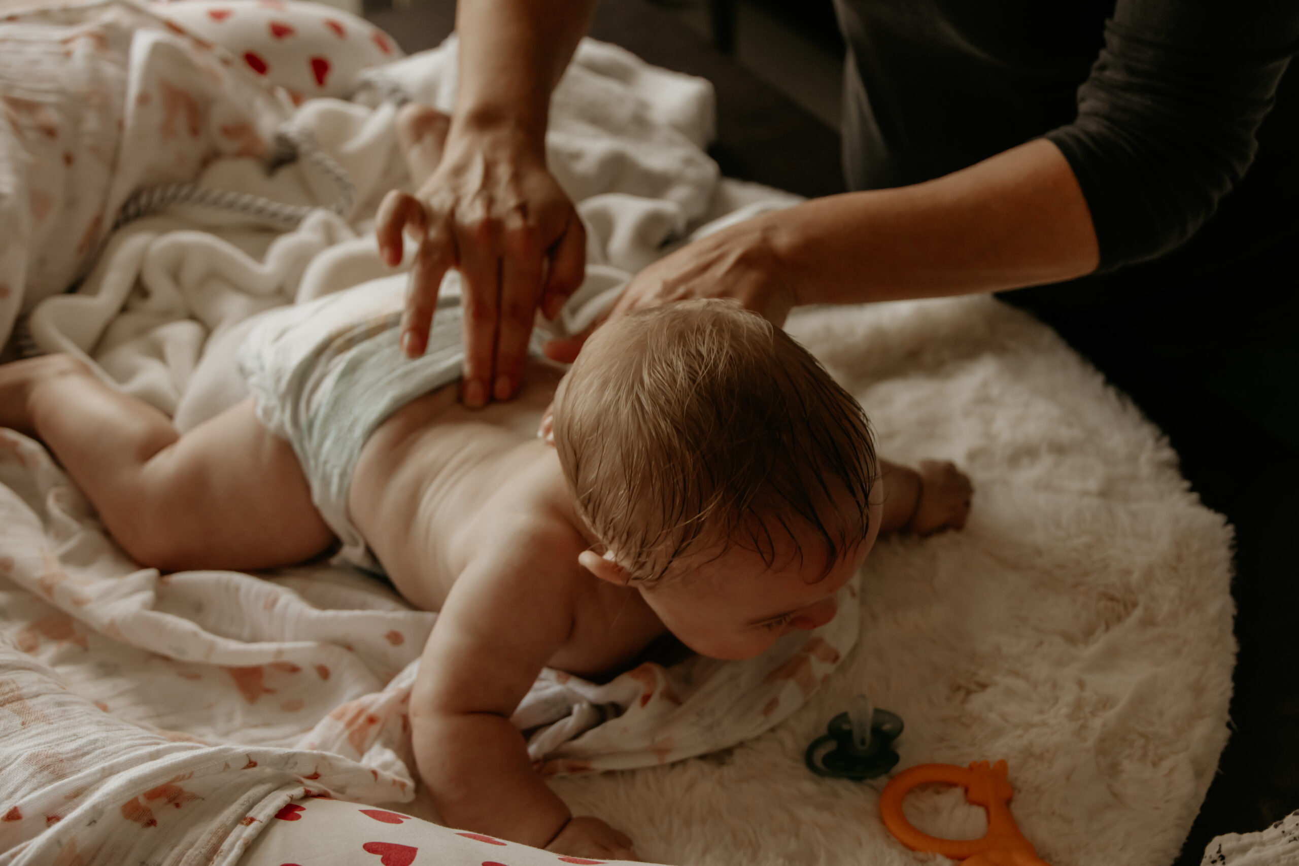 Ensuite, j’installe tout le matériel et l’espace pour le massage puis je vous montre comment déshabiller bébé de façon physiologique.
